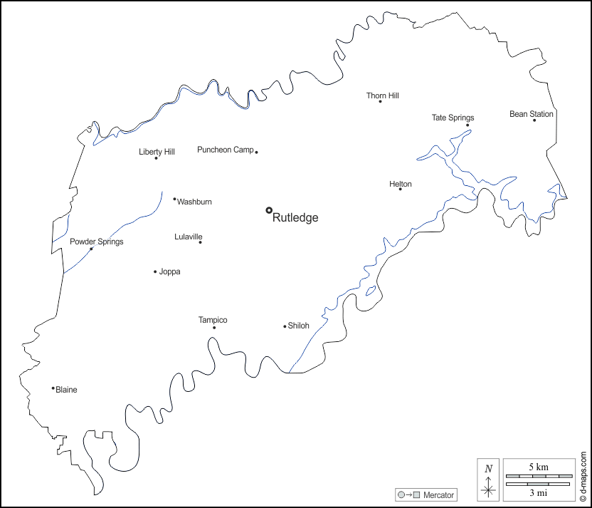 Bean Station, Blaine, Helton, Joppa, Liberty Hill, Lulaville, Powder Springs, Puncheon Camp, Rutledge, Shiloh, Tampico, Tate Springs, Thorn Hill, Washburn.