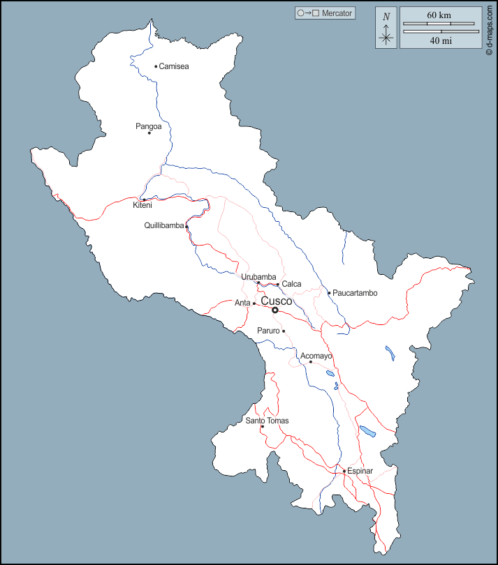 d-maps > 美洲 > 秘鲁 > 庫斯科 > 大纲, 水文学, 主要城市, 道路, 名称