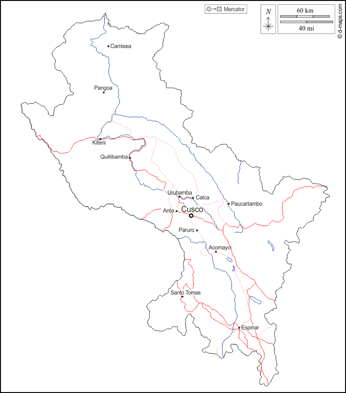 d-maps > 美洲 > 秘鲁 > 庫斯科 > 大纲, 水文学, 主要城市, 道路, 名称, 白