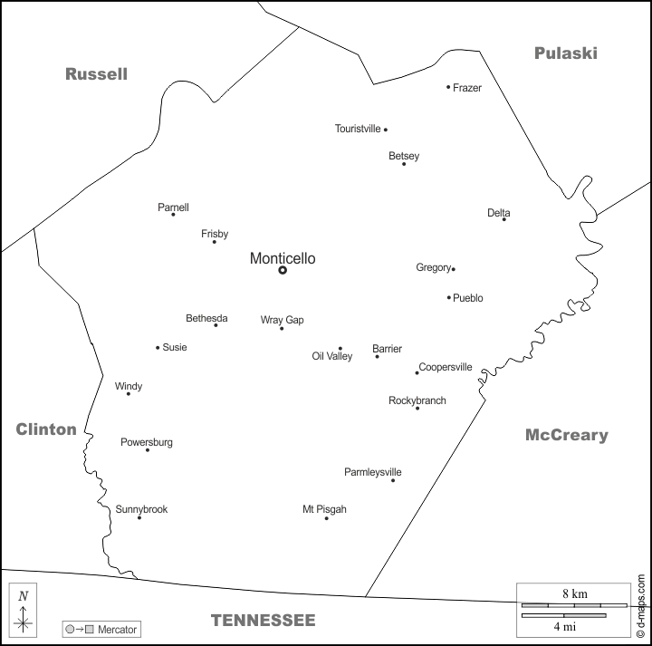d-maps > 美国 > 肯塔基州 > 韦恩县 > 边界, 主要城市, 名称, 白