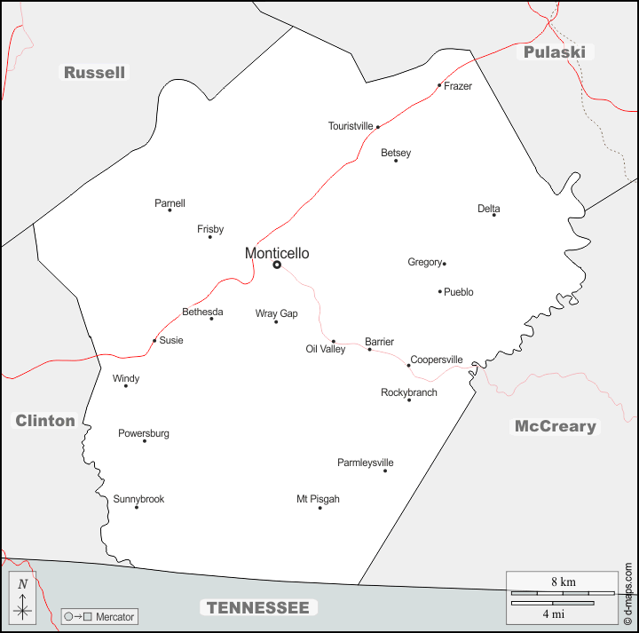 d-maps > 美国 > 肯塔基州 > 韦恩县 > 边界, 主要城市, 道路, 名称