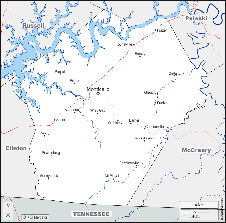d-maps > 美国 > 肯塔基州 > 韦恩县 > 边界, 水文学, 主要城市, 道路, 名称