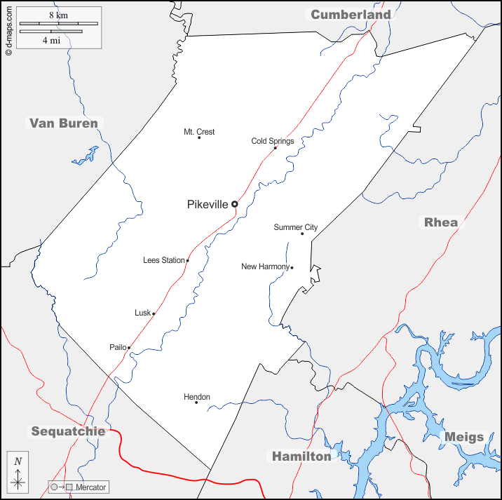 d-maps > 美国 > 田纳西州 > 布莱索县 > 边界, 水文学, 主要城市, 道路, 名称