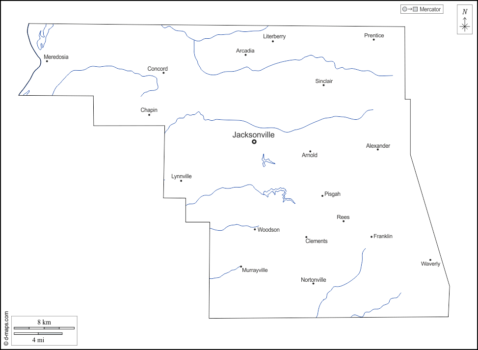 Alexander - Arcadia - Arnold - Chapin - Clements - Concord - Franklin - Jacksonville - Literberry - Lynnville - Meredosia - Murrayville - Nortonville - Pisgah - Prentice - Rees - Sinclair - Waverly - Woodson