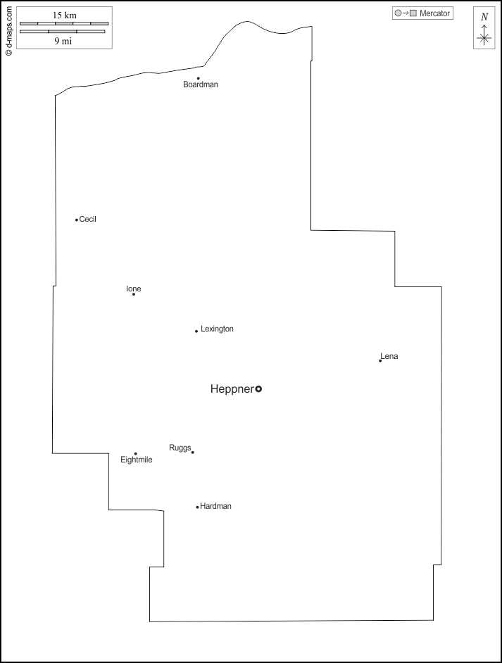 Boardman, Cecil, Eightmile, Hardman, Heppner, Ione, Lena, Lexington, Ruggs.