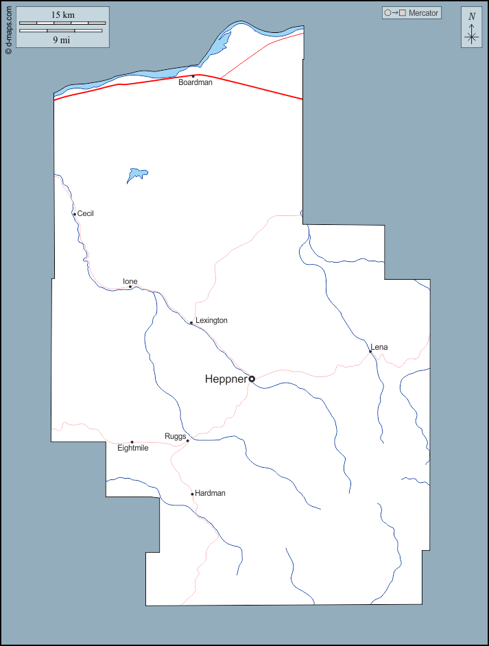 Boardman, Cecil, Eightmile, Hardman, Heppner, Ione, Lena, Lexington, Ruggs.