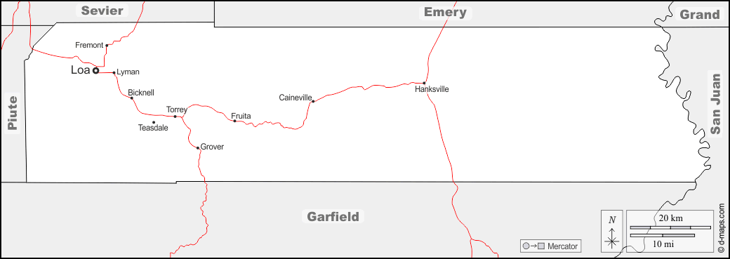 Bicknell, Caineville, Fremont, Fruita, Grover, Hanksville, Loa, Lyman, Teasdale, Torrey.