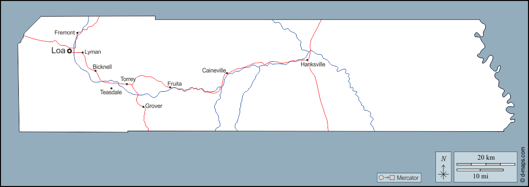 Bicknell, Caineville, Fremont, Fruita, Grover, Hanksville, Loa, Lyman, Teasdale, Torrey.