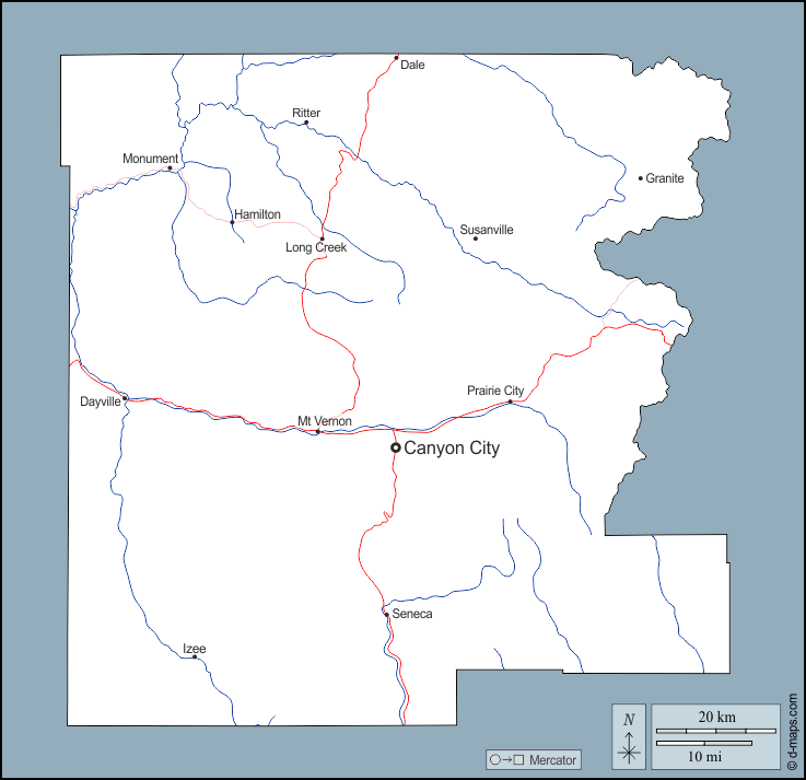 Canyon City, Dale, Dayville, Granite, Hamilton, Izee, Long Creek, Monument, Mt Vernon, Prairie City, Ritter, Seneca, Susanville.