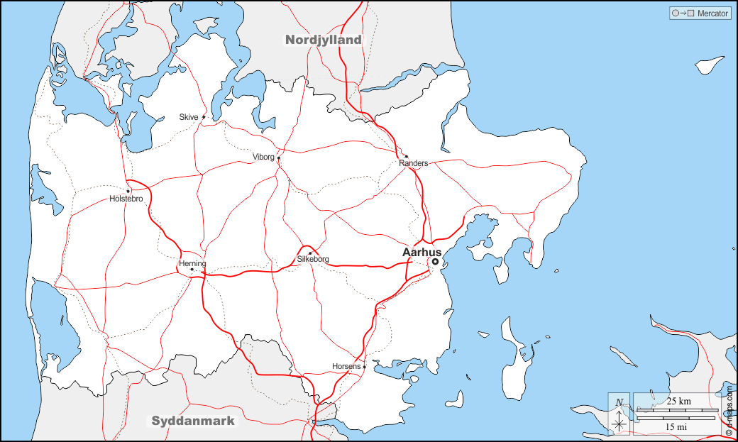 Aarhus, Herning, Holstebro, Horsens, Randers, Silkeborg, Skive, Viborg.