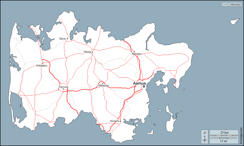 Aarhus, Herning, Holstebro, Horsens, Randers, Silkeborg, Skive, Viborg.