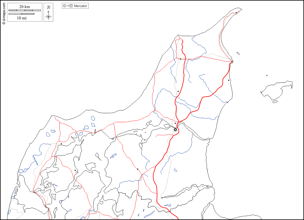 d-maps > 欧洲 > 丹麦 > 北日德兰大区 > 边界, 水文学, 主要城市, 道路, 白