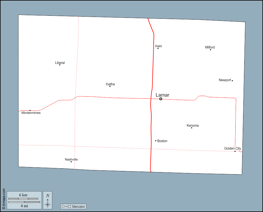 Boston, Golden City, Inatha, Irwin, Kenoma, Lamar, Liberal, Milford, Mindenmines, Nashville, Newport.