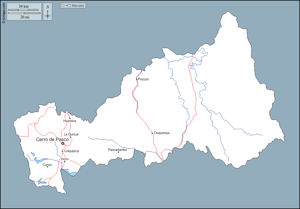 d-maps > 美洲 > 秘鲁 > 帕斯科大区 > 大纲, 水文学, 主要城市, 道路, 名称