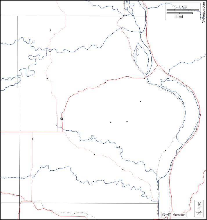 d-maps > 美国 > 艾奥瓦州 > 阿拉马基县 > 边界, 水文学, 主要城市, 道路, 白