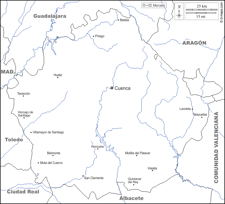 Belmonte, Beteta, Cuenca, Honrubia, Huete, Landete, Mota del Cuervo, Motilla del Palacar, Priego, San Clemente, Talayuelas, Tarancón, Villamayor de Santiago.