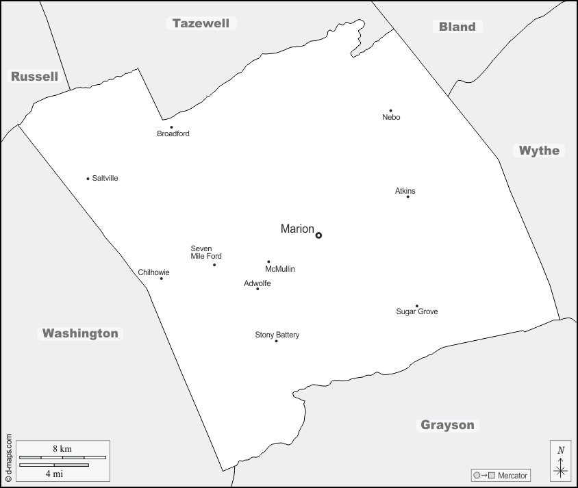 d-maps > 美国 > 弗吉尼亚州 > 史密斯县 > 边界, 主要城市, 名称