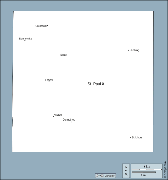 Cotesfield, Cushing, Dannebrog, Dannevirke, Elba, Farwell, Nysted, St. Libory, St. Paul.