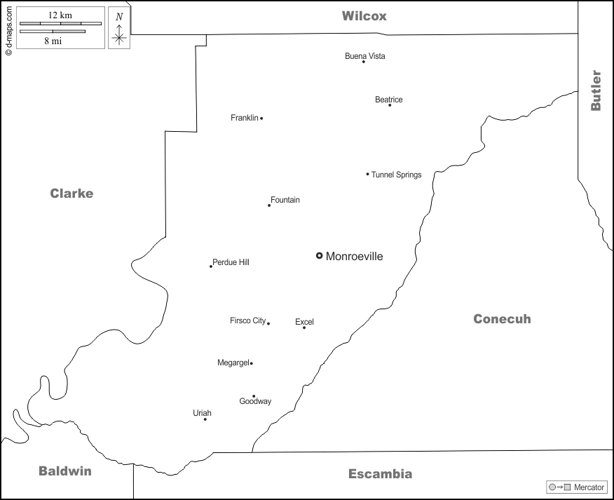 d-maps > 美国 > 亚拉巴马州 > 梦露县 > 边界, 主要城市, 名称, 白