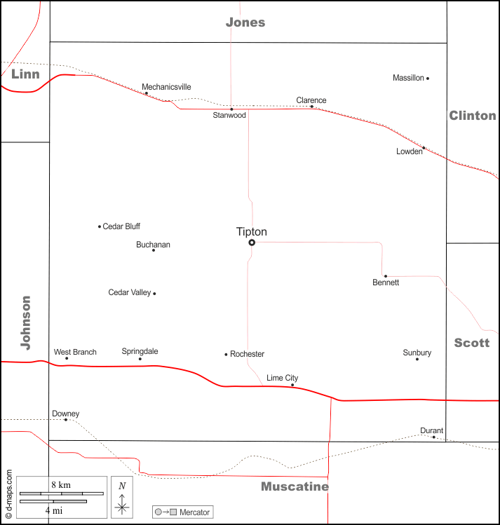 d-maps > 美国 > 艾奥瓦州 > 錫達縣 > 边界, 主要城市, 道路, 名称, 白