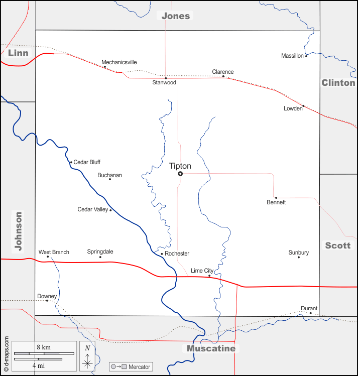 Bennett - Buchanan - Cedar Bluff - Cedar Valley - Clarence - Downey - Durant - Lime City - Lowden - Massillon - Mechanicsville - Rochester - Springdale - Stanwood - Sunbury - Tipton - West Branch