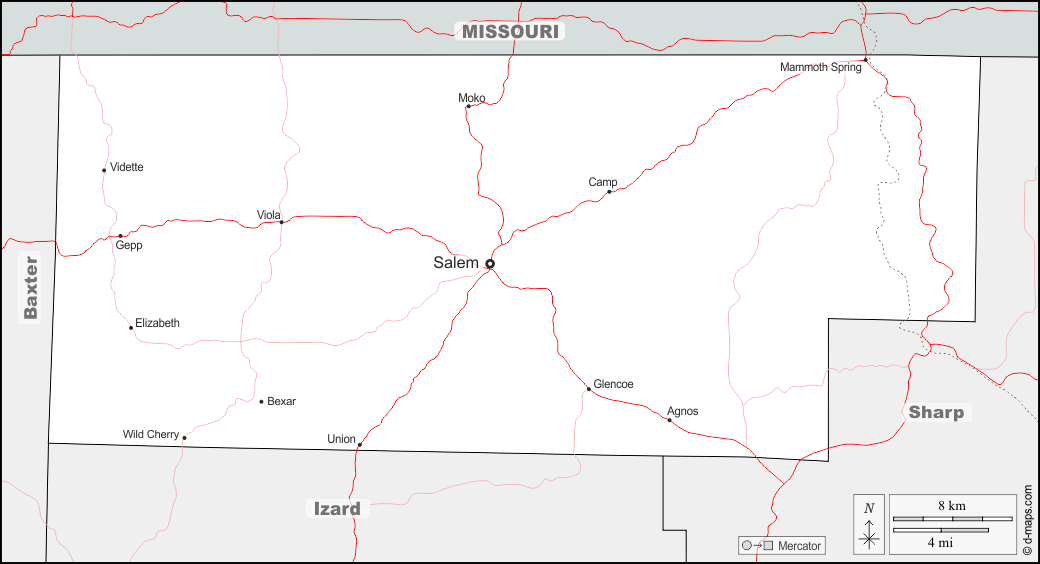 d-maps > 美国 > 阿肯色州 > 富爾頓縣 > 边界, 主要城市, 道路, 名称