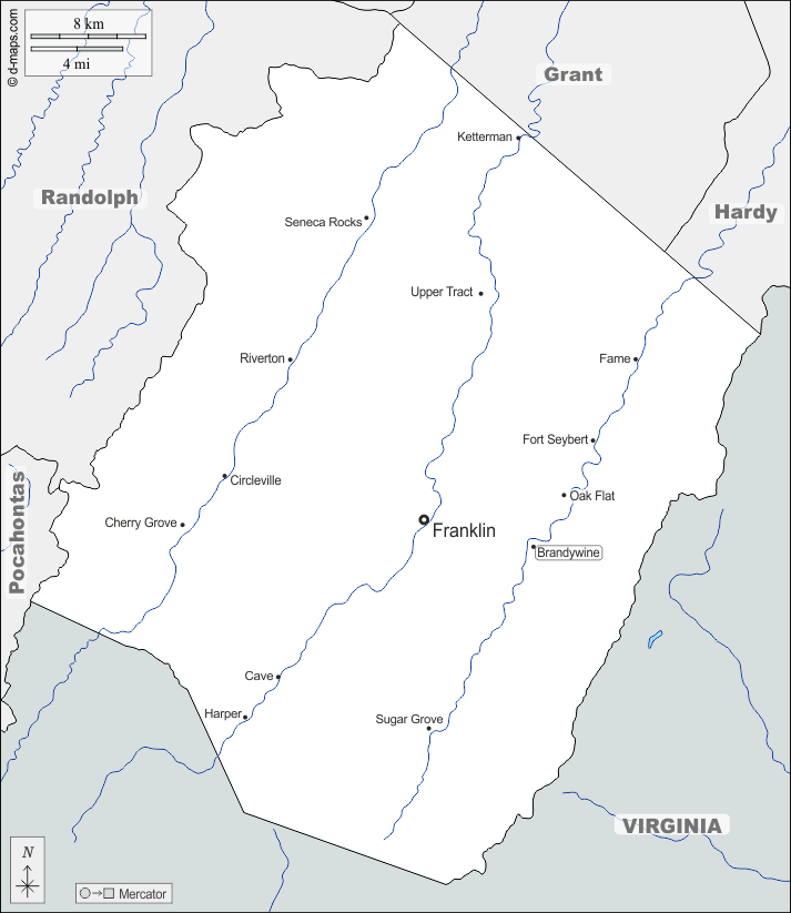 d-maps > 美国 > 西維吉尼亞州 > 彭德爾頓縣 > 边界, 水文学, 主要城市, 名称