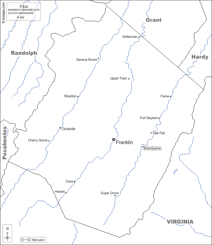 d-maps > 美国 > 西維吉尼亞州 > 彭德爾頓縣 > 边界, 水文学, 主要城市, 名称, 白