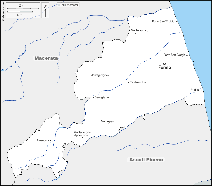 d-maps > 欧洲 > 意大利 > 費爾莫 > 边界, 水文学, 主要城市, 名称