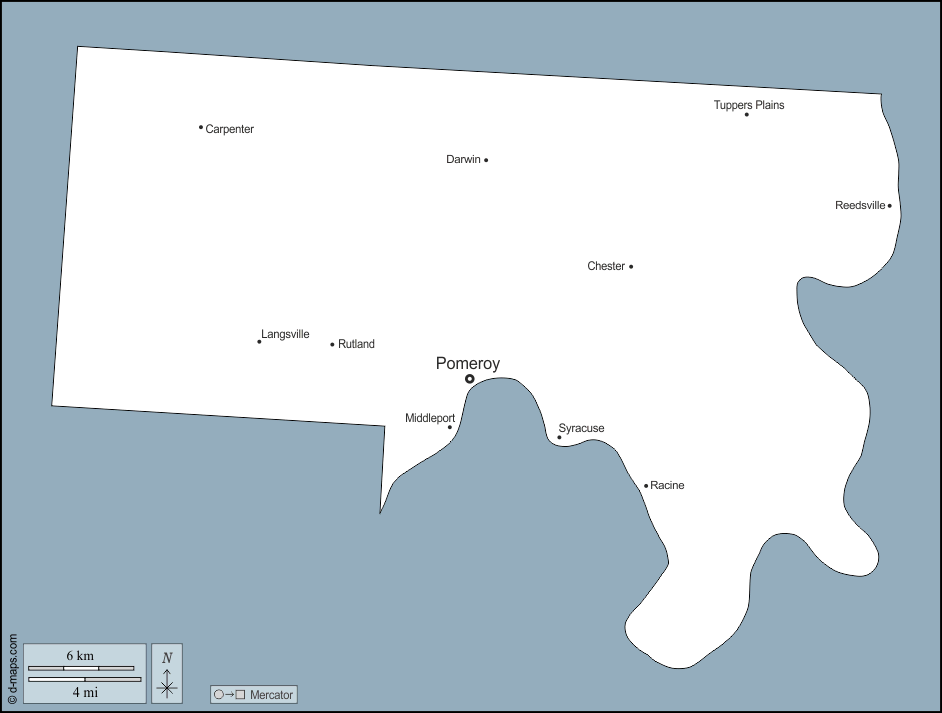 Carpenter - Chester - Darwin - Langsville - Middleport - Pomeroy - Racine - Reedsville - Rutland - Syracuse - Tuppers Plains