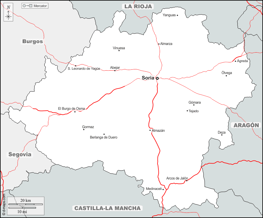 d-maps > 欧洲 > 西班牙 > 索里亚 > 边界, 主要城市, 道路, 名称