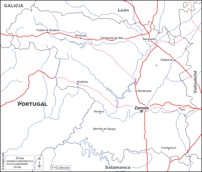 d-maps > 欧洲 > 西班牙 > 萨莫拉 > 边界, 水文学, 主要城市, 道路, 名称, 白