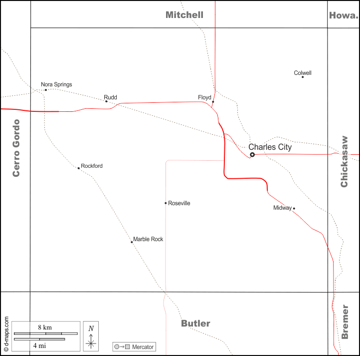 d-maps > 美国 > 艾奥瓦州 > 弗洛伊德縣 > 边界, 主要城市, 道路, 名称, 白