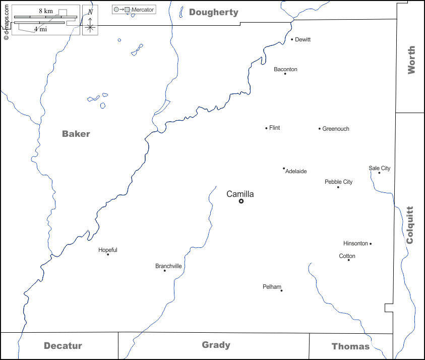 d-maps > 美国 > 喬治亞州 > 米切爾縣 > 边界, 水文学, 主要城市, 名称, 白