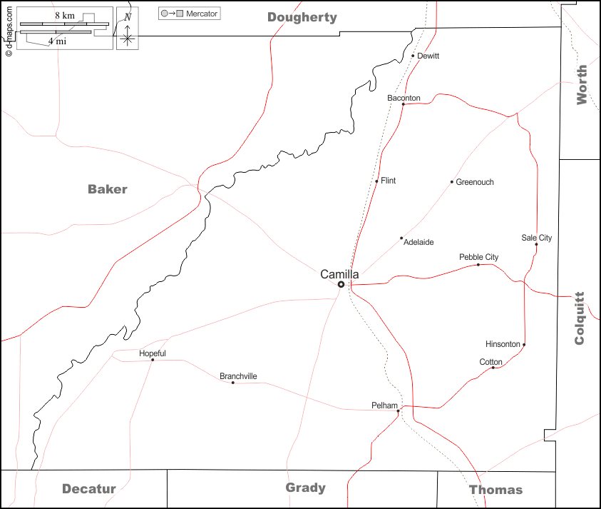 d-maps > 美国 > 喬治亞州 > 米切爾縣 > 边界, 主要城市, 道路, 名称, 白