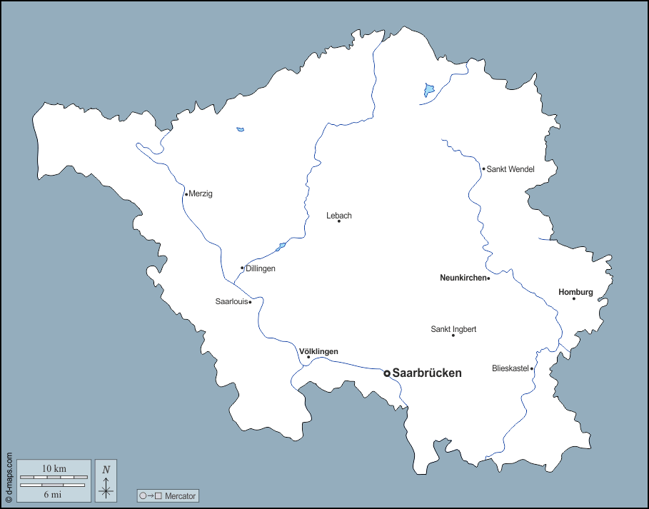 d-maps > 欧洲 > 德国 > 薩爾蘭 > 大纲, 水文学, 主要城市, 名称