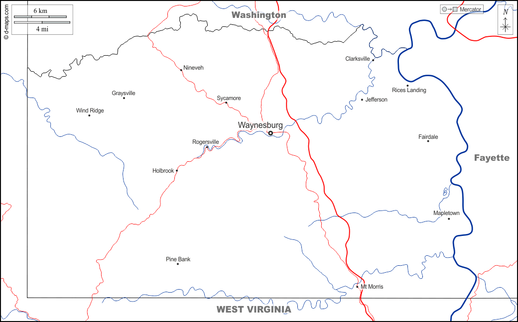 d-maps > 美国 > 宾夕法尼亚州 > 格林縣 > 边界, 水文学, 主要城市, 道路, 名称, 白