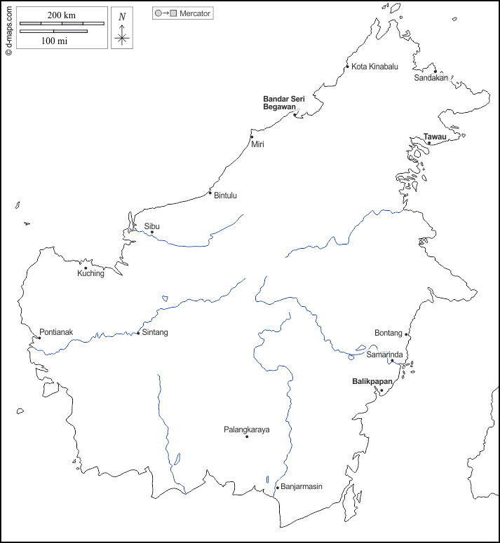 d-maps > 亚洲 > 婆罗洲 > 海岸, 水文学, 主要城市, 名称, 白