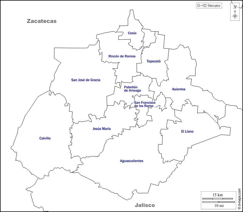 d-maps > 美洲 > 墨西哥 > 阿瓜斯卡連特斯州 > 边界, 市, 名称, 白