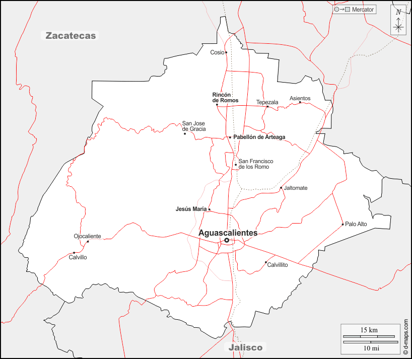 d-maps > 美洲 > 墨西哥 > 阿瓜斯卡連特斯州 > 边界, 主要城市, 道路, 名称