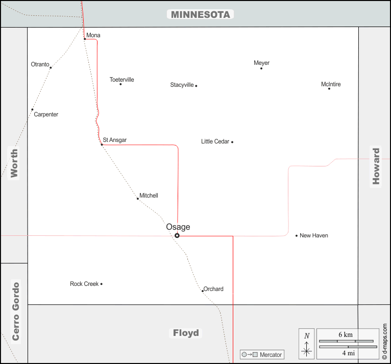 Carpenter - Little Cedar - McIntire - Meyer - Mitchell - Mona - New Haven - Orchard - Osage - Otranto - Rock Creek - St Ansgar - Stacyville - Toeterville