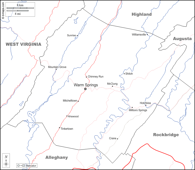 d-maps > 美国 > 弗吉尼亚州 > 巴斯縣 > 边界, 水文学, 主要城市, 道路, 名称, 白