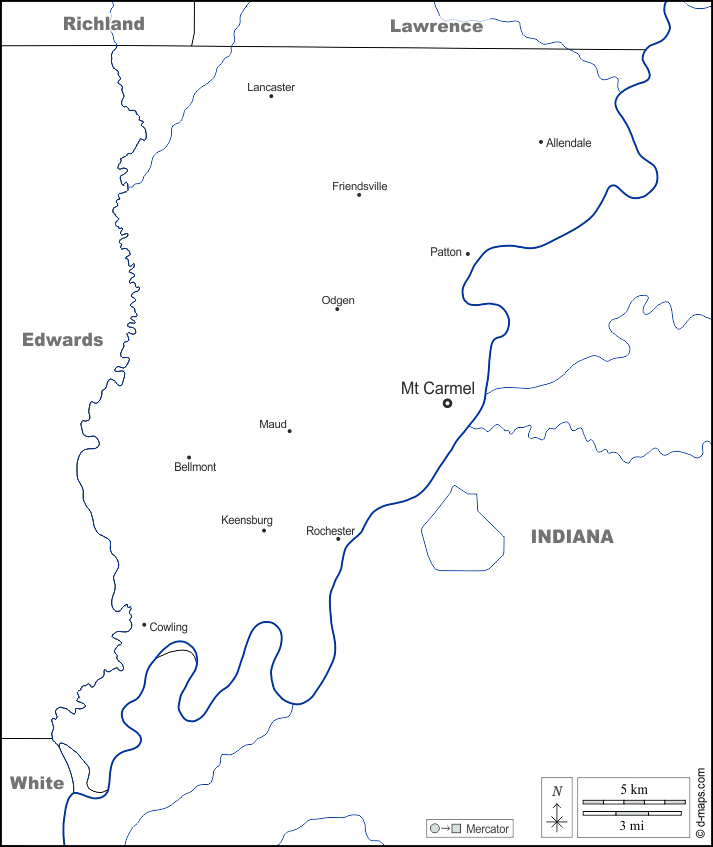 d-maps > 美国 > 伊利诺伊州 > 沃巴什縣 > 边界, 水文学, 主要城市, 名称, 白