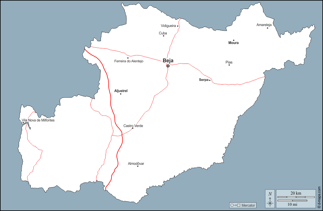 Aljustrel - Almodôvar - Amareleja - Beja - Castro Verde - Cuba - Ferreira do Alentejo - Moura - Pias - Serpa - Vidigueira - Vila Nova de Milfontes