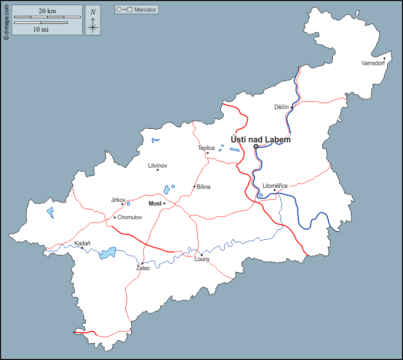 d-maps > 欧洲 > 捷克 > 烏斯季州 > 大纲, 水文学, 主要城市, 道路, 名称