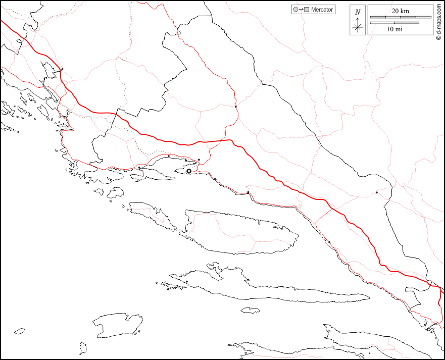 d-maps > 欧洲 > 克罗地亚 > 斯普利特-達爾馬提亞縣 > 边界, 主要城市, 道路, 白