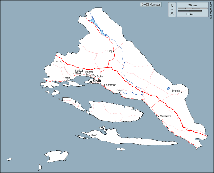 d-maps > 欧洲 > 克罗地亚 > 斯普利特-達爾馬提亞縣 > 大纲, 水文学, 主要城市, 道路, 名称