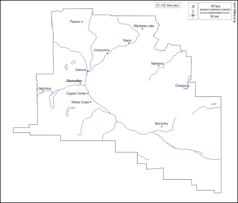 Chisana - Chistochina - Copper Center - Gakona - Glennallen - McCarthy - Mentasta Lake - Nabesna - Nelchina - Paxson - Slana - Willow Creek
