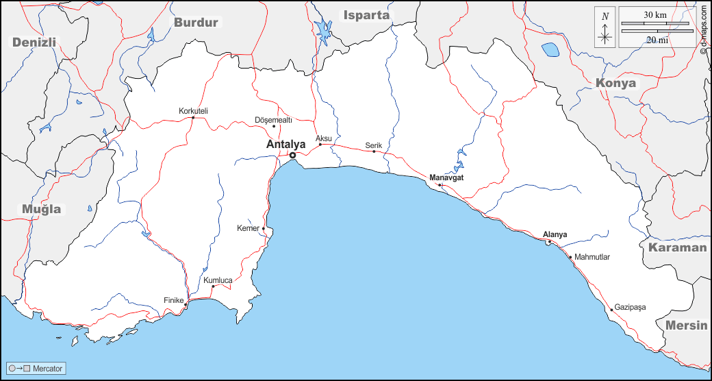 d-maps > 亚洲 > 土耳其 > 安塔利亚省 > 边界, 水文学, 主要城市, 道路, 名称