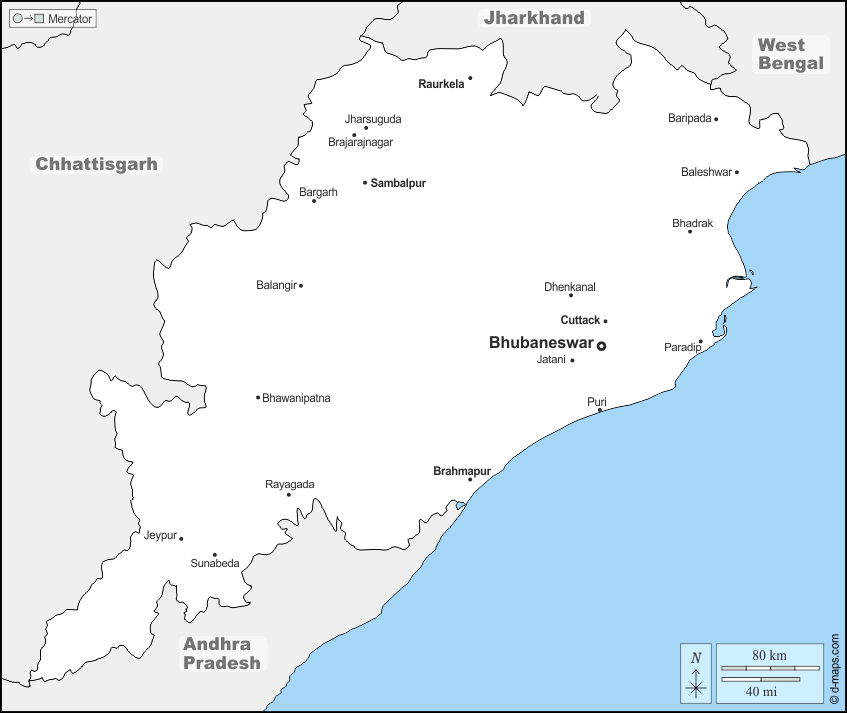d-maps > 亚洲 > 印度 > 奥里萨邦 > 边界, 主要城市, 名称